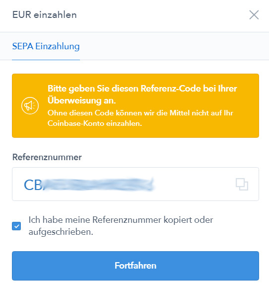 Nach der Bestätigung werden dir alle notwendigen Daten für eine normale SEPA Überweisung angezeigt. Überweise den gewünschten Betrag von deiner Bank auf das Konto von Coinbase. Bitte achte dabei darauf, dass du den Referenzcode im Verwendungszweck angibst. Die Überweisung dauert in der Regel 1-3 Arbeitstage.