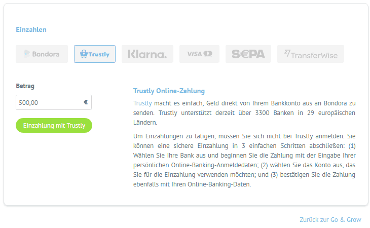 Auf der nächsten Seite kannst du eine Möglichkeit zur Einzahlung auswählen. Am schnellsten erfolgt die Einzahlung über Trustly.