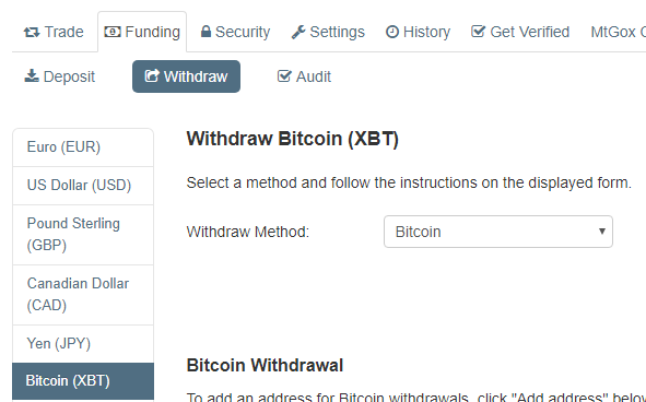Wähle anschließend im Menü Bitcoin (XBT) und als Auszahlungsmethode (Withdraw Method) Bitcoin aus.